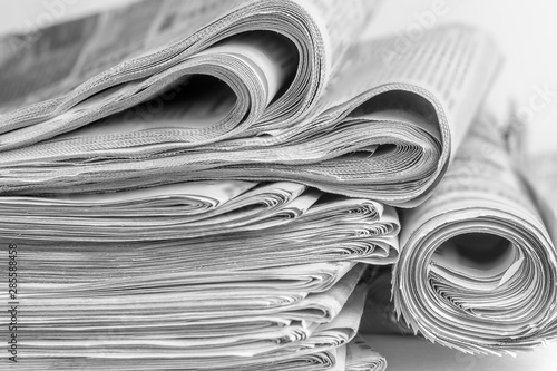 A stack of folded newspapers on the desktop in the office. Latest financial and business news in daily paper.