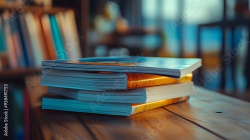 A stack of freshly printed magazines on a wooden table with a blurred background, inviting readers to explore its content