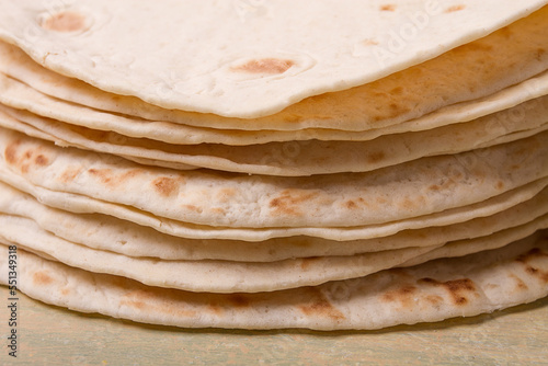 A stack of Mexican tortillas, on a gray table, top view, close-up, no people,