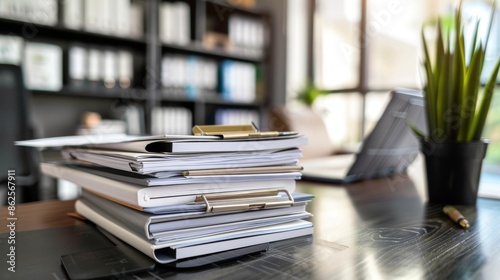 a stack of papers and a clipboard on a wooden desk in an office setting.