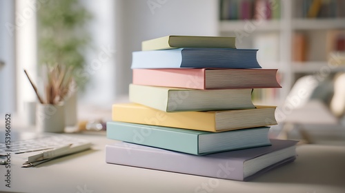 A stack of pastel colored books on a desk with art supplies and a bookshelf in the background scene