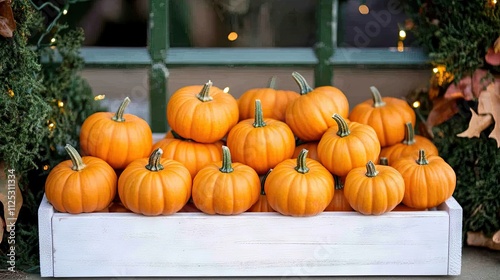 A stack of small bright orange pumpkins on a white crate, with a festive garland in the background