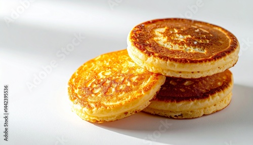 A stack of three golden-brown pancakes, shot against a bright background. The pancakes appear fluffy and delicious.