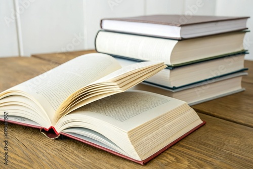 A stack of two open soft cover books on a wooden table, softcover books, fiction, non-fiction, textbook, learning resources