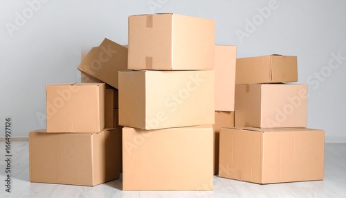 A stack of various-sized cardboard boxes sits on a light floor against a plain wall