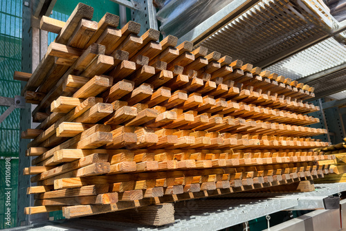 A stack of wooden pallets rests neatly in natural light, showcasing the efficiency of material organization at a busy construction site.