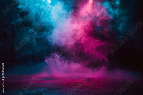 A stage with thick burgundy smoke under a light cyan spotlight, contrasting dramatically against a dark background.