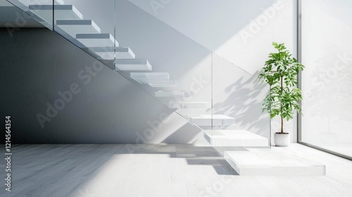 A staircase with floating steps and transparent glass railings, adding a sleek and unique architectural feature to a modern home