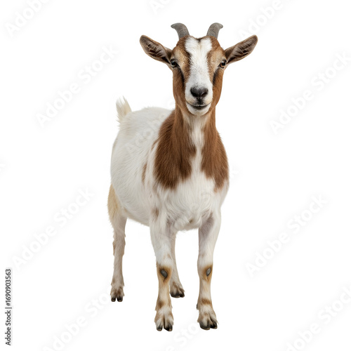 A standing goat with brown and white patches on its fur, facing forward with small horns.