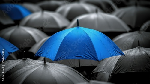 A standout blue umbrella towering over a crowd of gray umbrellas, symbolizing risk management and unique strategy.
