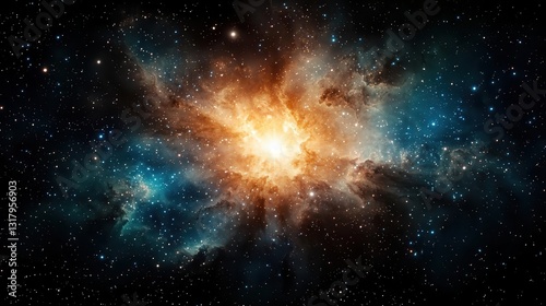 A star cluster glowing brightly in different hues of blue and yellow, surrounded by cosmic clouds on green