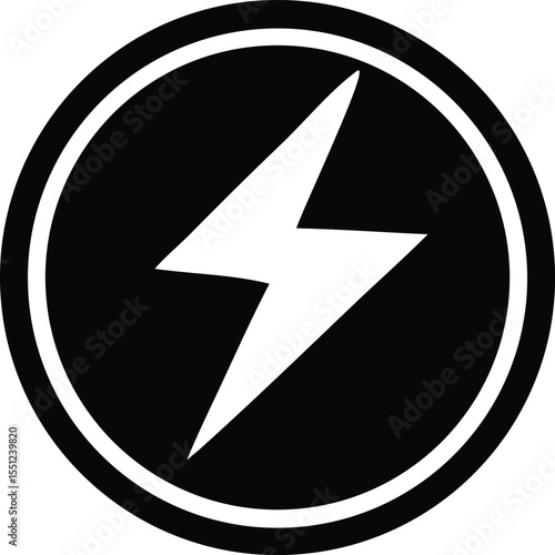 A stark black circle encloses a bold white lightning bolt symbolizing power and energy within a clean modern design