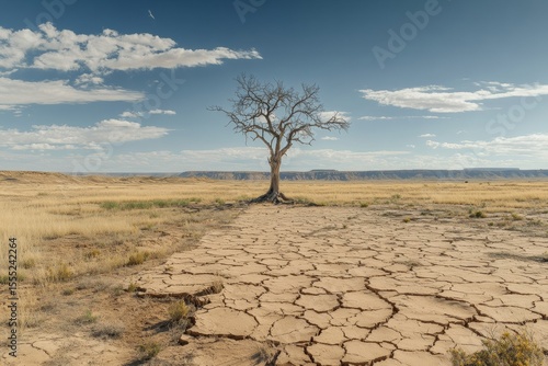 A stark desert landscape shows cracked ground and a single lifeless tree standing alone. The clear sky highlights the arid environment, emphasizing the effects of drought