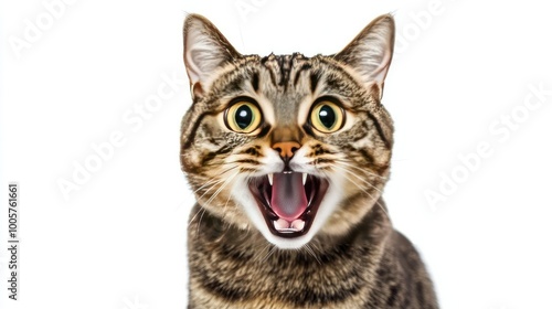 A startled and angry cat with a hilarious wide-eyed, open-mouth expression, frozen mid-movement, isolated against a clean white background.