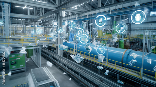A state-of-the-art manufacturing facility with digital icons highlighting renewable energy sources and sustainability certifications, showcasing eco-friendly operations.