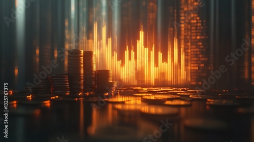 A steady upward financial graph with glowing lines, coins stacked neatly at the base under a soft spotlight, surrounded by a minimalist modern background, ultra-clear rendering, cinematic tones,