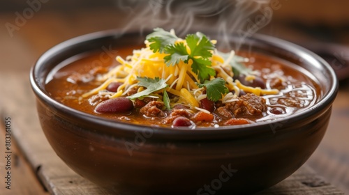 A steaming bowl of hearty chili soup filled with tender meat and beans, garnished with shredded cheese and fresh cilantro