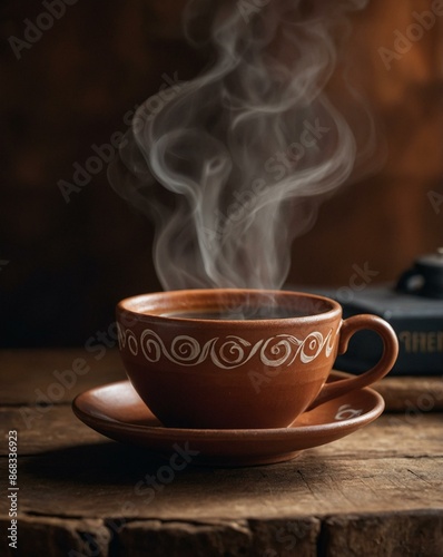 A steaming coffee served in an intricate clay mug placed on a rustic tabletop, creating a homely and warm setting.