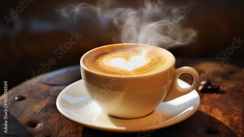 A steaming cup of cappuccino with a heart-shaped design in the foam on a wooden table.