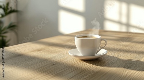 A steaming cup of coffee on a light wooden table, bathed in sunlight streaming through windows