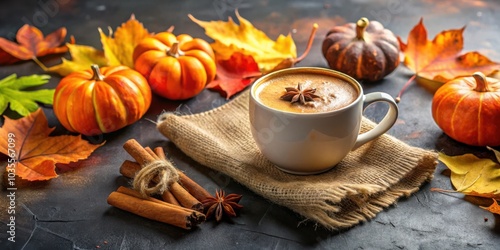 A steaming cup of coffee with a star anise garnish, surrounded by autumn leaves and small pumpkins, a cozy and inviting scene.
