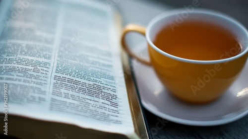 A steaming cup of tea sits beside an open book with small text, creating a cozy and intellectual atmosphere for reading and relaxation
