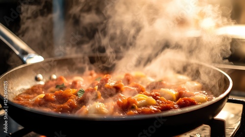 A steaming pan of rich tomato sauce, bubbling with flavor, as it simmers on the stove, ready to be added to pasta or pizza