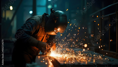 A steelworker in a helmet welding, creating bright sparks that illuminate the industrial workspace. The image captures the intensity and skill involved in metalworking
