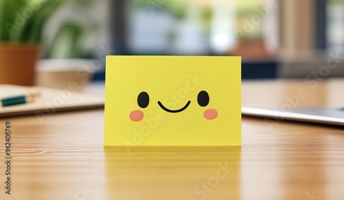 A Sticky Note with a Happy Face or the Word “Hello” On A Desk - Yellow