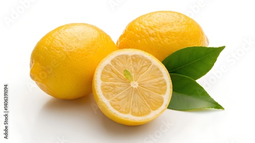 A still life image of two lemons, one cut in half and a lemon slice on a white background
