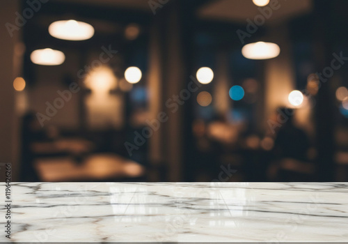A still life image with a focus on the texture of a marble surface, set against a backdrop of a dimly lit restaurant, with a modern and elegant setting