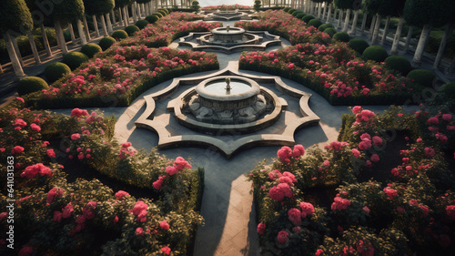 A still life of a carnation or rose garden with a fountain. Architecture with walking paths.