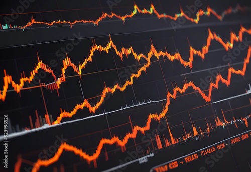 A stock market chart showing candlestick patterns against a dark background with red and blue lights, indicating financial data and trends