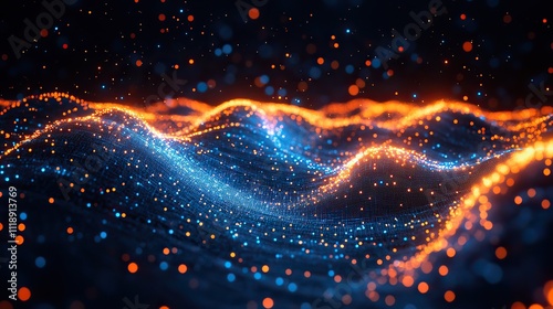 A stock market graph with blue and orange lines displays a pattern of movements on an abstract digital background, visualizing market trends and data analysis