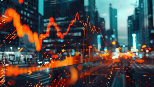 A stock market graph with orange and black lines reflecting the movement of creatures on digital screens in front of city buildings at night, emphasizing dynamic motion above virtual charts and graphs