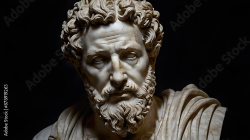 A stoic bust of Marcus Aurelius, sculpted from weathered marble with cracks and veins that hint at the passage of time, bathed in dramatic chiaroscuro lighting that accentuates Generative AI