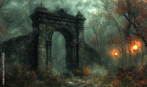 A stone archway in a misty autumn forest, adorned with orange lanterns. The scene evokes a sense of mystery and age