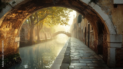 A Stone Bridge Over a Canal in Venice, Italy with Mist and Golden Light