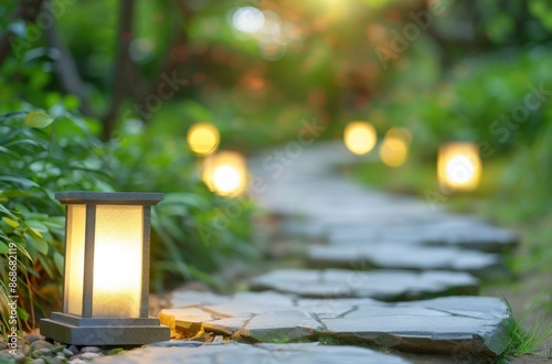 A stone path lit by warm lanterns winds through a lush green garden. The path leads to a bright, sun-drenched area.