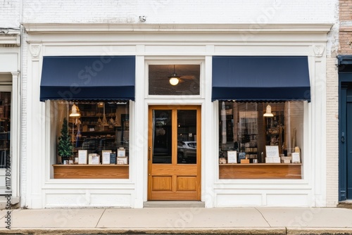 A store front with a blue awning and a white door. The door is open and there is a car parked in front of the store. Empty space for logo or text, mockup