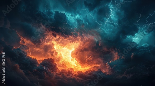 A stormy sky with a bright orange and blue lightning bolt. Generative AI
