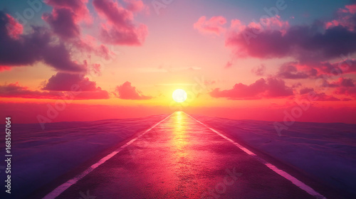 A straight road with an arrow pointing forward towards a sunrise, symbolizing a clear path to career success and professional growth