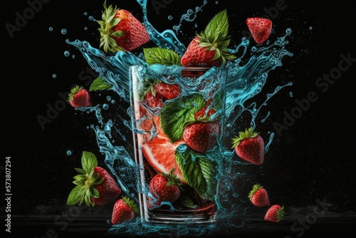 A Strawberry Mojito, to be exact. Strawberry mojitos with fresh mint, lemon juice, and ice cubes are displayed on a blue wooden table during the summer. against a black backdrop. Generative AI