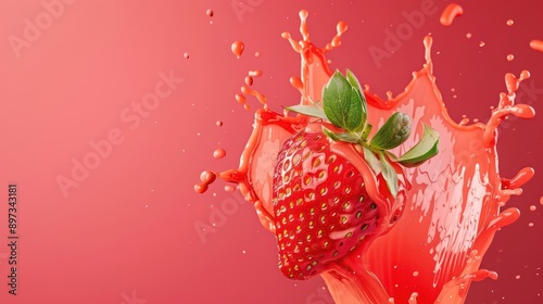 A strawberry slice splashing into a burst of sweet juice, banner, with copy space