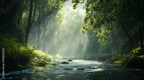 A stream of water flows through a forest, with sunlight shining through the trees. The scene is peaceful and serene, with the water reflecting the sunlight and creating a calming atmosphere