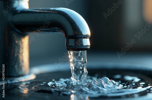 A stream of water pours from a faucet into a sink. International worlds water day celebrated on March 22. Consumption, protection and saving of water recourses concept. AI generated image