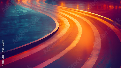 A striking abstract composition of curves and lines, bathed in neon blue and orange lighting, creating a modern and futuristic aesthetic