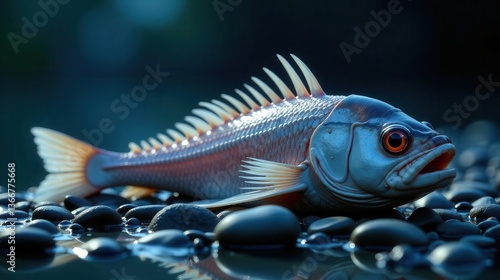 A Striking Aquatic Creature Rests on Smooth, Dark Pebbles Near Tranquil Water