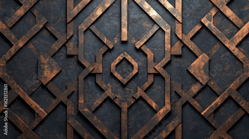 A striking Art Deco geometric pattern in metallic bronze against a dark, textured background