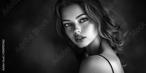 A striking black and white image captures the elegance of a lovely woman as she poses gracefully for the camera, showcasing her beauty and poise.